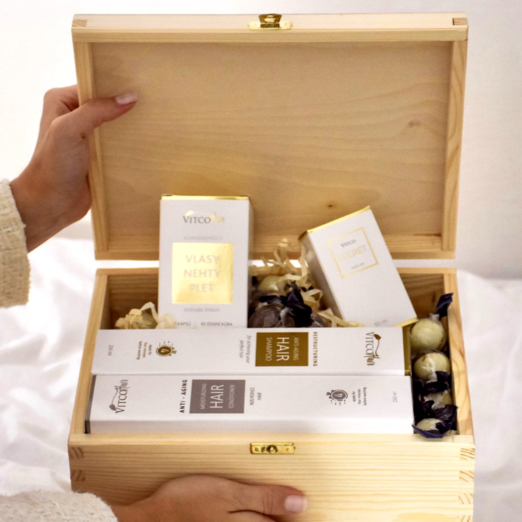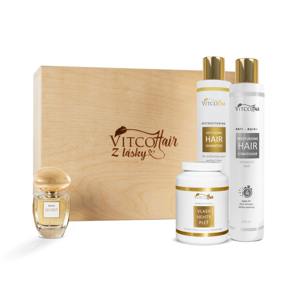 Objevte dárkové balení, které v sobě skrývá víc než jen krásu – je to tajemství, které čeká na odhalení. Prémiový šampon, kondicionér, kapsle VitcoHair a smyslný parfém Vitco Secret, jenž podtrhne její jedinečnost.